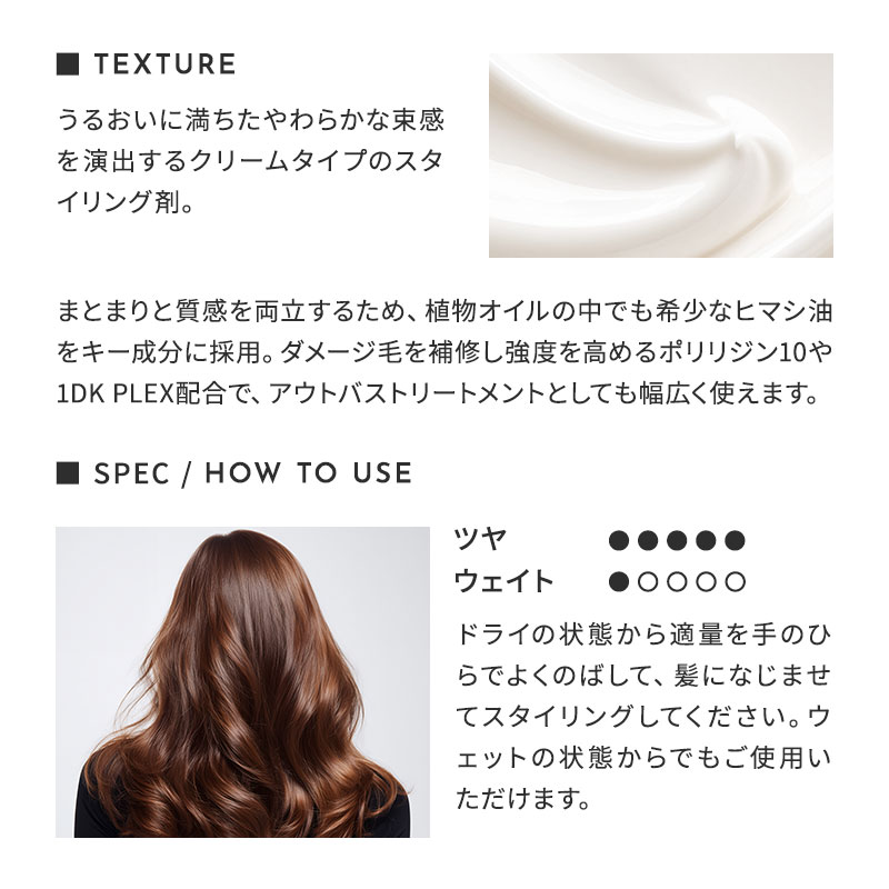 - ドライな質感を表現するスタイリング剤。髪馴染みの良いテクスチャーが細部までの表現を可能にします。