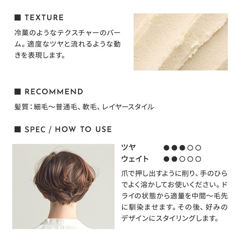- ドライな質感を表現するスタイリング剤。髪馴染みの良いテクスチャーが細部までの表現を可能にします。