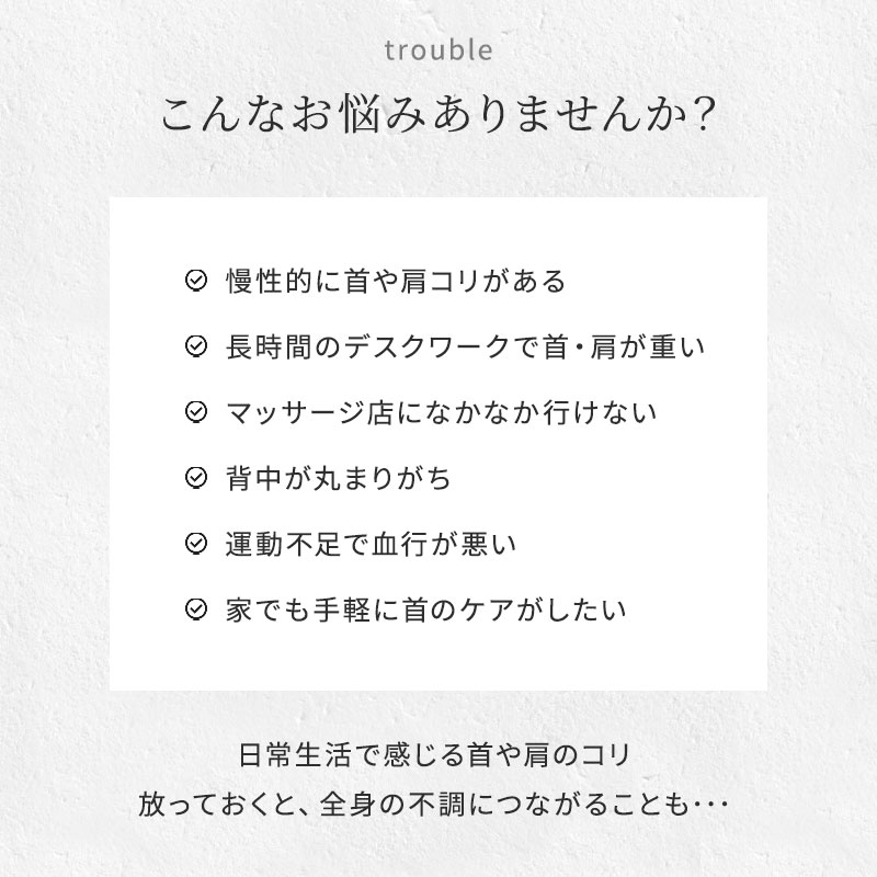 - check_circle長時間のデスクワークで首・肩が重い