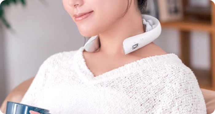 中周波EMSによる筋肉内部の刺激とモーターによる物理的な外部刺激、近赤外線によるやさしい暖かさとヒーターによる直接的な温かさ。異なる2つの刺激と2つの温かさを組み合わせることで、複雑で立体的なマッサージ感覚を実現した首用のEMS運動機器です。