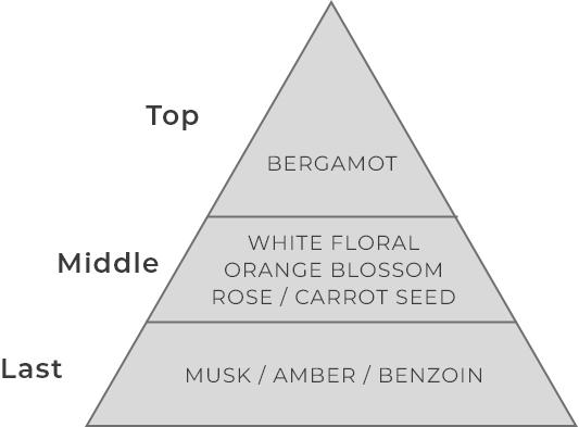 ムスクとアンバーが深みを与える中、ホワイトフラワーとオレンジブロッサムが軽やかな風に溶け込み、ローズとキャロットシードが甘美なエッセンスを放ちます。