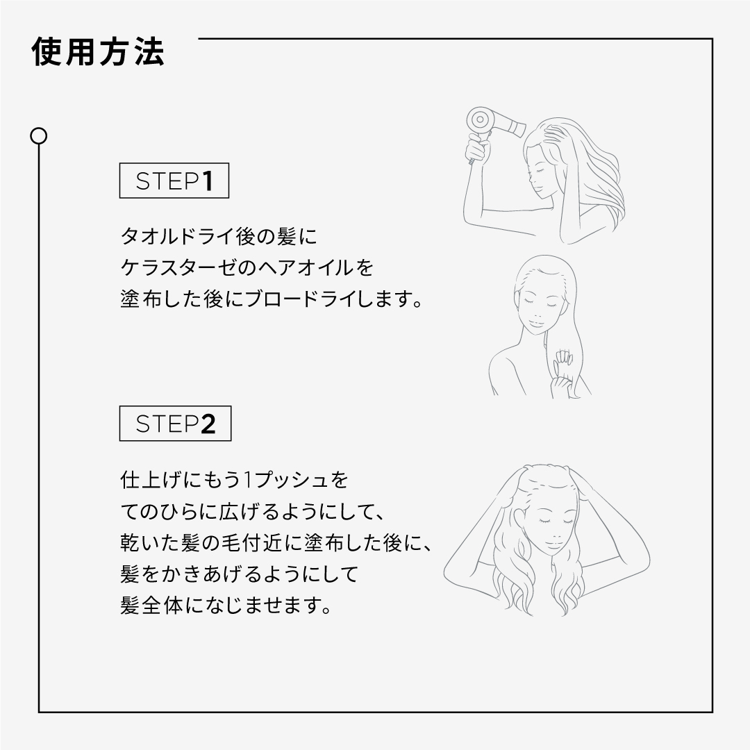 - 根元をしっかりと乾かし、中間~毛先の順番で乾 かしていきます。熱で乾かすというより、風で水気を飛ばすイメージで。 ※毛先の乾かし過ぎに要注意です。