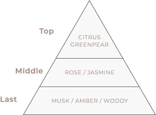 みずみずしいペアーが柔らかく広がり、ローズやスズランの花々が優雅に咲き誇る。ラストはムスクとパチョリの温もりがそっと寄り添い、透明感のある上品な余韻を残す。