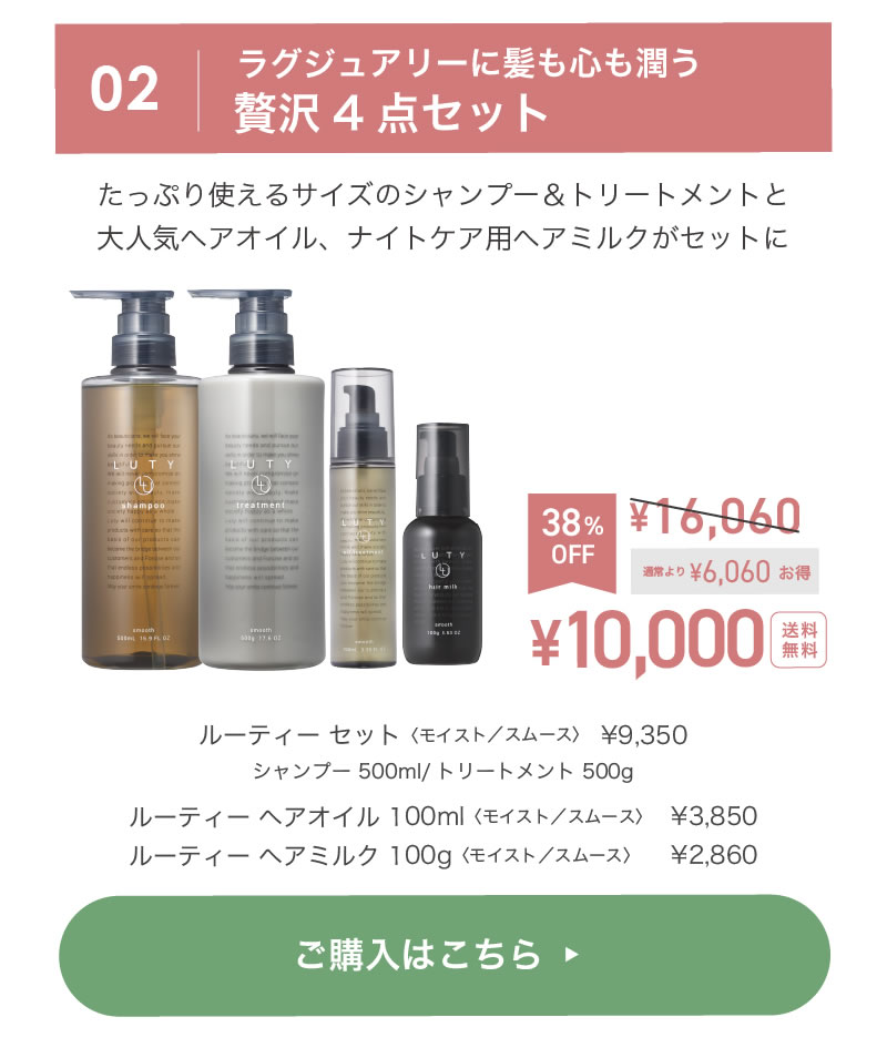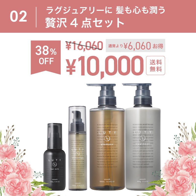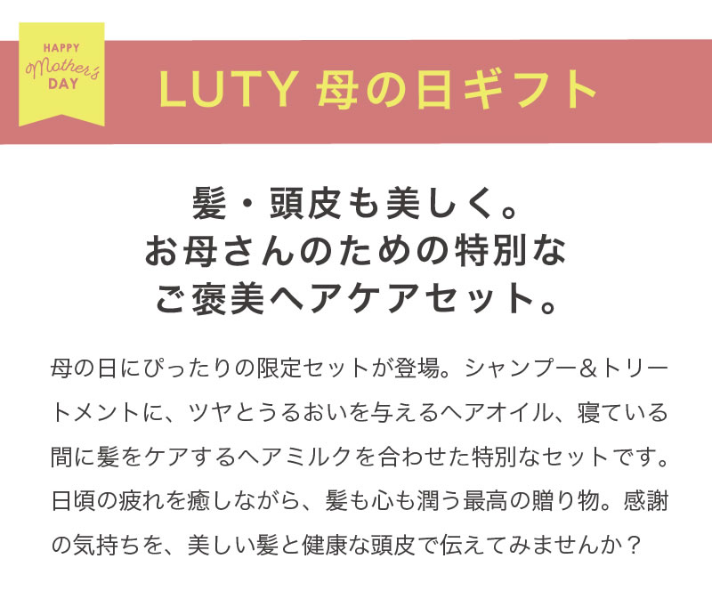 TOP > キャンペーン > 母の日 2026 > 【母の日ギフトセット】LUTY ルーティー シャンプー 500ml & トリートメント 500g & ヘアオイル 100ml & ヘアミルク 100g セット