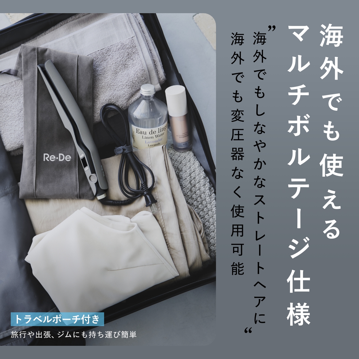 マルチボルテージ仕様 - 世界中どこでも、しなやかなストレートヘアを。変圧器なしで海外でもそのまま使えるから、旅行や出張でもいつものスタイリングが叶います。付属のトラベルポーチで持ち運びもスマートに。ジムやお泊まりにも、気軽に連れていけます。