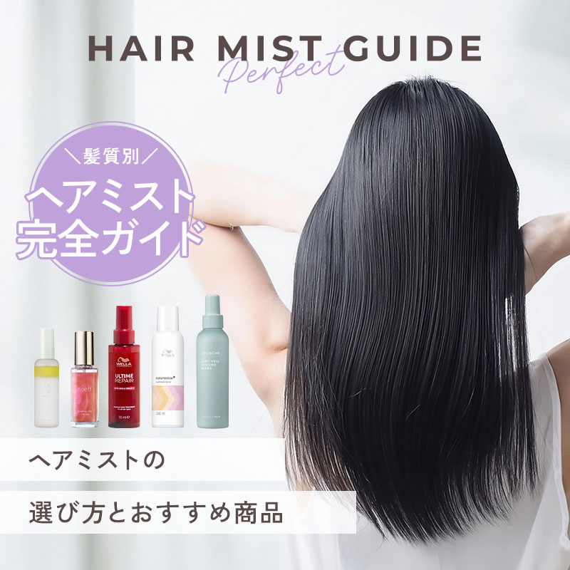 ヘアミストはこれらよりも軽やかで、髪全体に均一に塗布しやすいのがメリット。保湿、香り付け、寝ぐせ直し、スタイリング補助、紫外線や熱からの保護など、製品によってさまざまな効果が期待できます。