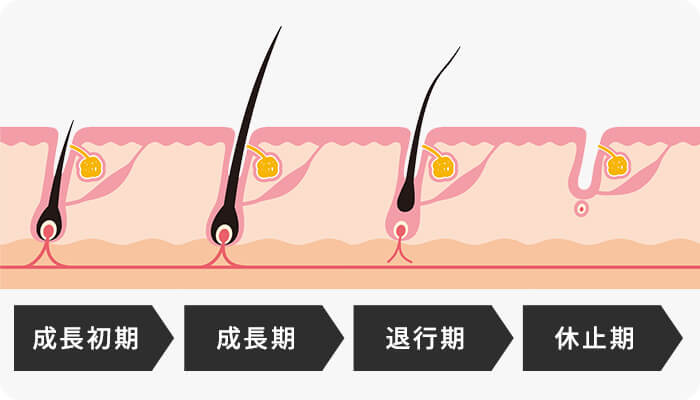 健康な毛周期であれば、成長期太く長いまつ毛が育ちます。また、退行期に抜け落ちてしまったとしても、すぐに新しいまつ毛の成長が始まります。